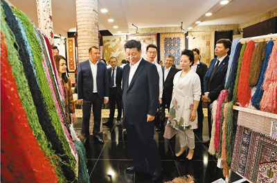 習(xí)近平和彭麗媛走進(jìn)波依卡揚(yáng)建筑群旁的一家地毯和絲綢作坊。紡織女工們正在制作布哈拉傳統(tǒng)手工地毯,用嫻熟的技藝織成色彩斑斕的圖案。 王滬寧、栗戰(zhàn)書(shū)、楊潔篪等陪同參觀。 |