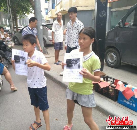 陳國西11歲的女兒和表弟向路人展示尋人啟事。韓章云 攝