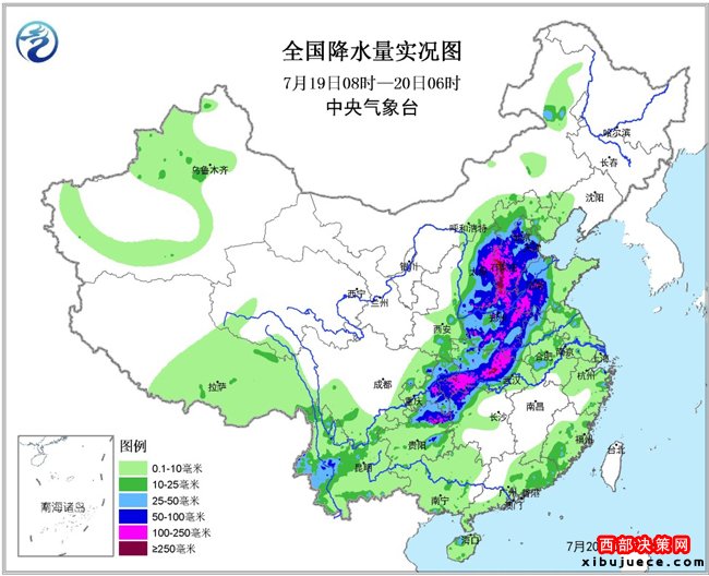 19日,一條強降雨縱貫中東部,山西東部、河北中南部、北京西南部、山東西部、河南北部和南部及湖北中部和西南部、湖南西北部、貴州東北部等地出現(xiàn)大暴雨,河北西南部及河南安陽和南陽、山西陽泉和晉中、湖北荊門、隨州和恩施、貴州銅仁等地部分地區(qū)出現(xiàn)特大暴雨,河北石家莊市平山、井陘和贊皇、邢臺市臨城和內邱、邯鄲涉縣和磁縣、河南安陽林州、湖北荊州京山等局地降雨400~616毫米,上述局地1小時最大降雨100~140毫米。