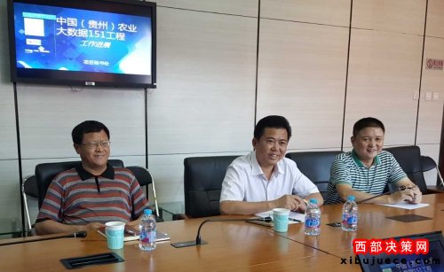 中國農(nóng)科院農(nóng)業(yè)信息研究所副所長王文生(左一)、貴州省銅仁高新技術(shù)開發(fā)區(qū)管委會主任寇啟聰(中)與中國網(wǎng)大數(shù)據(jù)門戶網(wǎng)總裁謝金明(右一)聽取工程進(jìn)展匯報
