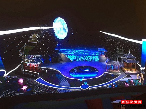 今年秋晚的舞美設(shè)計制作本著厲行節(jié)約的原則,對演播現(xiàn)場現(xiàn)有的實景建筑做了最大化的利用。晚會以中國目前最大的仿唐建筑群紫云樓為觀眾席背景,在廣場一側(cè)的人工景觀湖上搭建舞臺。舞臺主體通過一幅展開的中國傳統(tǒng)畫軸形象,將西安城墻和大明宮角樓等元素有機地結(jié)合到一起,實現(xiàn)臺在水上、水在臺中的夢幻效果,營造出一種穿越千年、貫通古今的浪漫。