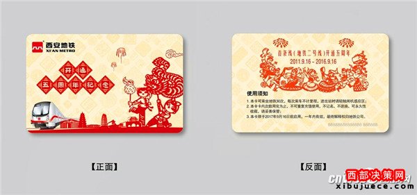“西安地鐵開通5周年紀(jì)念卡”正反面。