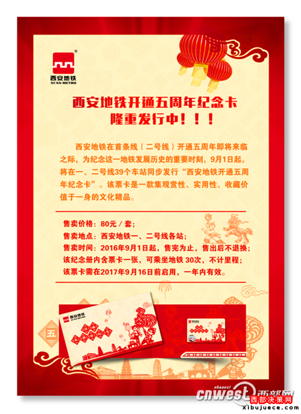 9月1日起,西安地鐵將在一、二號線39座車站同步發(fā)行“西安地鐵開通5周年紀(jì)念卡”,售價80元。