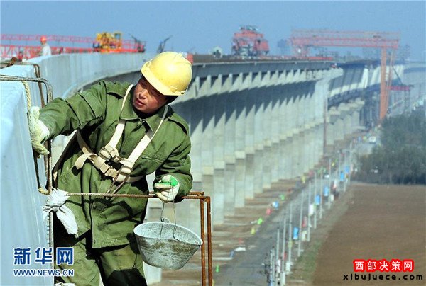 在京廣高鐵黃河大橋施工現(xiàn)場(chǎng),一名工人在橋體上作業(yè)(2009年8月13日攝)。
