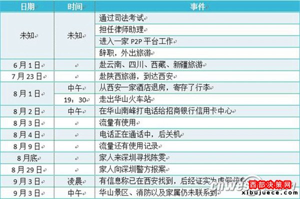 據(jù)陳雯表姐蔡女士介紹,陳雯于2016年6月1日起,自深圳前往云南、西藏、新疆等地游玩,7月22日自烏魯木齊飛往咸陽,隨后與家人失去聯(lián)絡(luò),且微信好友均被拉黑,自8月2日起,手機便處于關(guān)機狀態(tài)。