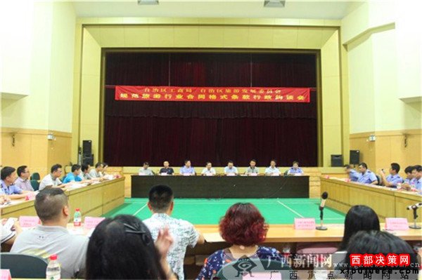 自治區(qū)旅游發(fā)展委員會、南寧市工商局等單位的領導和代表,自治區(qū)格式合同評審委員會的部分專家、全區(qū)30家旅行社的代表等70余人參加了此次約談會,通過召開規(guī)范旅游業(yè)合同格式條款行政約談會議,對一年來專項執(zhí)法檢查中發(fā)現的、普遍存在的旅游業(yè)不公平合同格式條款進行集中點評。通過點評,給予旅游企業(yè)政策性宣傳輔導和告誡,以這種行政指導的形式,引導企業(yè)規(guī)范使用格式合同,推動經營者依法自律經營,切實維護廣大消費者的合法權益。