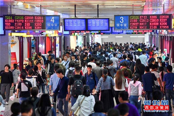 10月7日,乘客在鄭州火車站內(nèi)準備進站乘車。