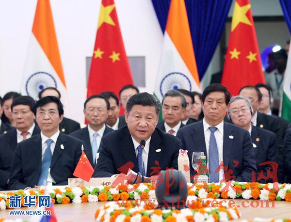 2016年10月16日,金磚國(guó)家領(lǐng)導(dǎo)人第八次會(huì)晤在印度果阿舉行。中國(guó)國(guó)家主席習(xí)近平、印度總理莫迪、南非總統(tǒng)祖馬、巴西總統(tǒng)特梅爾、俄羅斯總統(tǒng)普京出席。習(xí)近平發(fā)表題為《堅(jiān)定信心共謀發(fā)展》的重要講話。新華社記者姚大偉攝