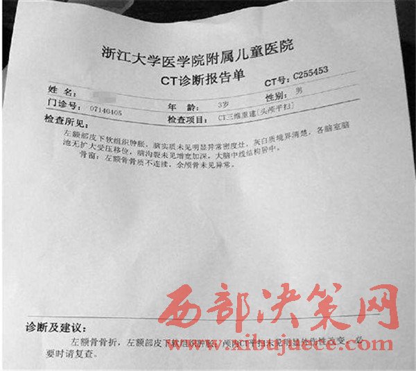 為了確認孩子的傷情,我和幼兒園的園長帶著孩子到了杭州的一家醫(yī)院進行檢查,檢查結果顯示孩子臉部骨折。