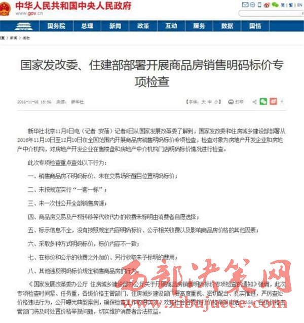 近日,國家發(fā)改委及住建部聯(lián)合發(fā)布了對商品房“明碼標(biāo)價”的新一輪整治措施。部署從2016年11月10日至12月10日在全國范圍內(nèi)開展商品房銷售明碼標(biāo)價專項檢查。此次專項檢查重點查處以下八類行為。“明碼標(biāo)價”、“一套一標(biāo)”、“醒目”、“自愿”、“一致”成為重點關(guān)鍵詞。
