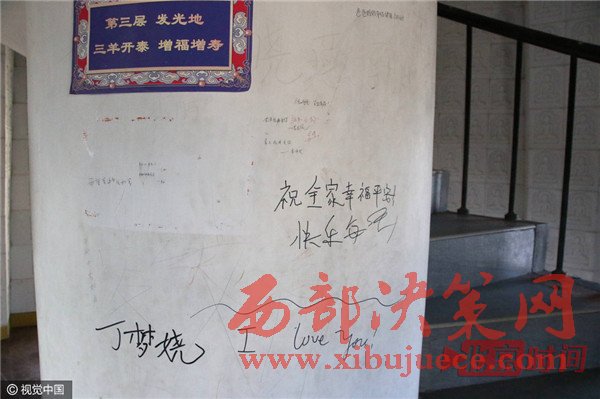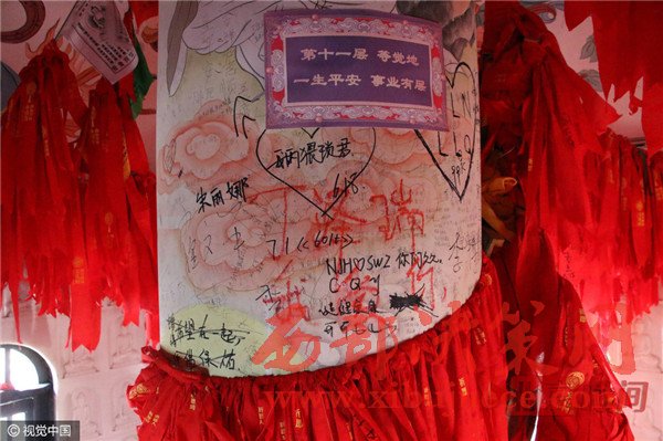 日前,向游客免費(fèi)開(kāi)放的山東省無(wú)棣縣大覺(jué)寺海豐塔內(nèi)壁遭到游客涂鴉,幾乎每一層內(nèi)墻壁都被刻滿(mǎn)了情話(huà)和祝福語(yǔ),連墻壁裝飾的佛像圖畫(huà)都不能幸免。圖為海豐塔內(nèi)壁遭游客涂鴉,刻滿(mǎn)了情話(huà)和祝福語(yǔ)。