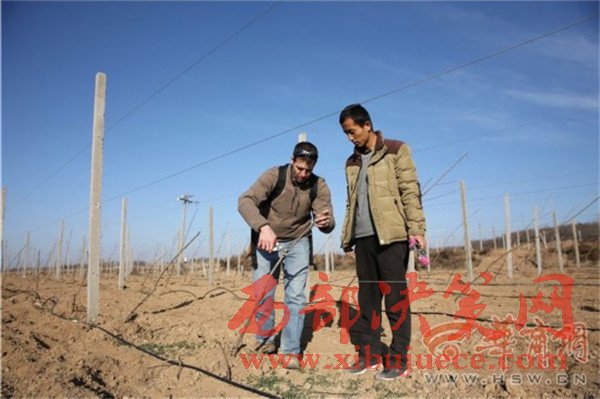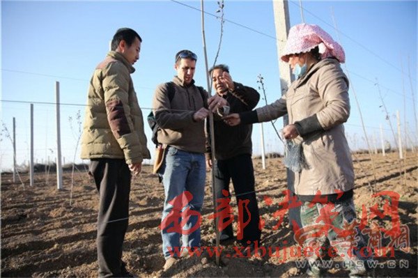 12月8日上午8時30分,淳化縣卜家鎮(zhèn)蔣家山村,當?shù)毓r剛吃完早飯,林東已從100多公里外的西安趕到這里,他一邊用熟練的中文問大家“咥飽了沒有”,一邊從背包里掏出果樹剪刀,走進地里查看樹苗的過冬情況。果園的技術員拿個大本子跟在林東后邊做記錄,遇到難點林東就親自示范。