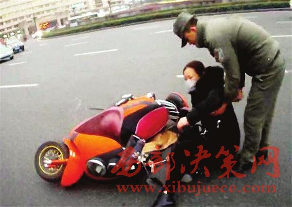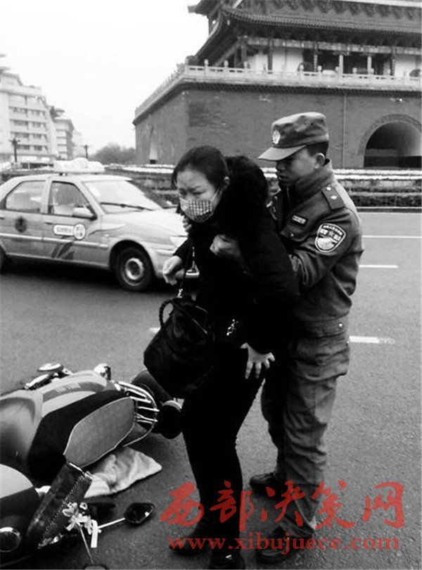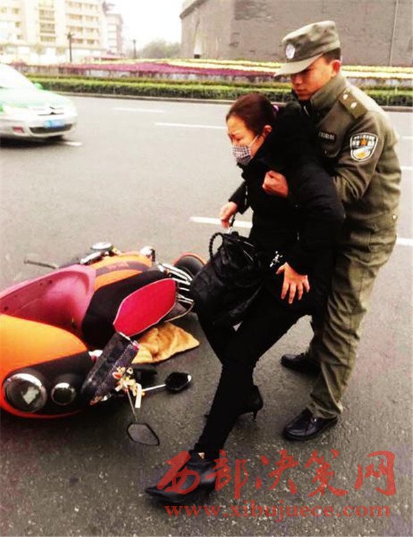 昨天17時(shí)10分,碑林區(qū)城市管理局柏樹林中隊(duì)執(zhí)法隊(duì)員馬奔和張翼在鐘樓開元商城區(qū)域正常開展巡查時(shí),突然看見一名中年女子騎著電動(dòng)車路過鐘樓十字右拐過程中,被一輛轎車撞了一下,緊接著,騎車的中年女子連人帶車倒在地上,肇事車輛當(dāng)場逃逸。