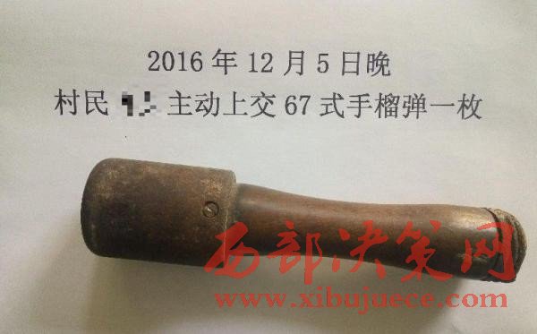 紫陽東木鎮(zhèn)村民冉某來到東木派出所,主動(dòng)上交了一個(gè)自己一直用來砸核桃的物件,民警一看吃了一驚,這個(gè)東西竟然是67式手榴彈!民警立即進(jìn)行了檢查,該手榴彈雖然沒有拉火裝置,但是不能確定彈體內(nèi)是否還有炸藥。