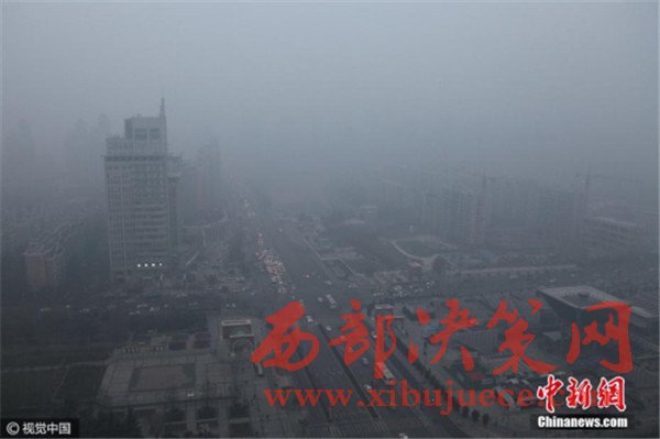 2016年12月19日,鳥瞰西安城市,霧霾籠罩,不太遠(yuǎn)的建筑也幾乎被霧霾“吞噬”,看不到一點影,當(dāng)日早八點,空氣質(zhì)量指數(shù)達(dá)409,為嚴(yán)重污染。 圖片來源:視覺中國