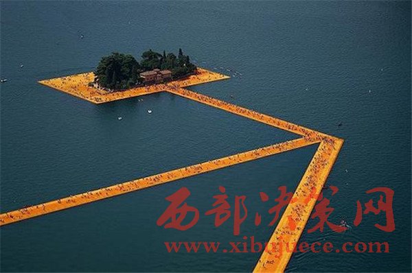 當代概念藝術(shù)家Christo因開拓土地藝術(shù)而聞名。在他最新的項目漂浮碼頭中,Christo搭建了很多亮黃色的小路,邀請意大利Sulzano的居民和游客步行通勤至別的導語。和Christo的其他裝置一樣,漂浮碼頭作品中的其他地方景觀也扮演著重要的角色。“湖周圍的山脈提供了鳥瞰該作品的地點,展現(xiàn)了那些之前沒被注意的角度”,他解釋道。“水、風、太陽,都是這個項目的一部分。”