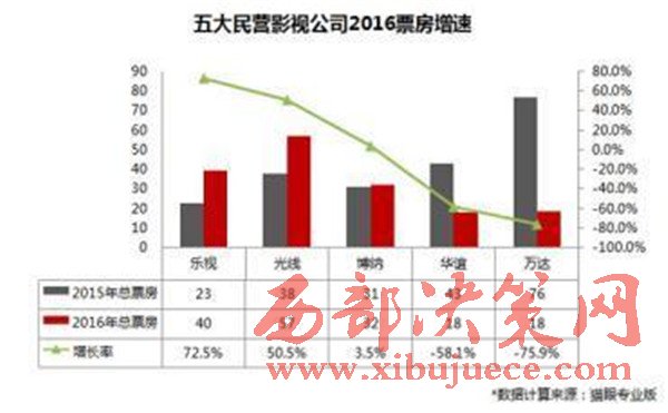 在單個(gè)公司增長(zhǎng)層面,樂(lè)視影業(yè)最為突出,2016年的票房增長(zhǎng)率達(dá)到了72.5%;光線影業(yè)2016年的票房增長(zhǎng)率達(dá)到35.9%,博納影業(yè)2016年的票房幾乎與去年持平,票房增長(zhǎng)率為3.5%;華誼兄弟影業(yè)2016年票房增長(zhǎng)率為-58.2%,萬(wàn)達(dá)影視2016年的票房增長(zhǎng)率為-75.9%,票房波動(dòng)較大。