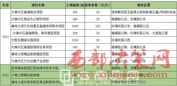 首先是2013年7月,昆明滇池國家旅游度假區(qū)一次性發(fā)布了8個項目的招商信息,總占地面積6533畝,總投資額預計約293億元。2015年7月,昆明滇池國家旅游度假區(qū)又發(fā)布了3個項目的招商信息,總占地面積705畝,總投資額預計約24億元。除了大批量的項目統(tǒng)一招商之外,另有部分項目也在陸陸續(xù)續(xù)的招商推進中,但因旅游項目開發(fā)投資題量大、建設周期長、回報慢等制約因素,大漁片區(qū)開發(fā)多年以來落地項目卻寥寥無幾。除了大漁欣城,在建的倚瀾苑項目,再無其他項目有實質性進展。