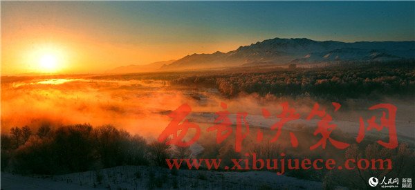 綿延百里的新疆尼勒克縣喀什河谷次生林在冷空氣的作用下,霧氣蒸騰,21萬畝林帶凝成了玉樹瓊花的霧凇景觀。迎著日出的霞光,從山上向下俯視,整個(gè)河谷云蒸霞蔚,宛如置身云端。翻滾的云海讓遠(yuǎn)山和近樹若影若現(xiàn),恍若仙境。待太陽升高,再浮現(xiàn)河谷次生林帶,猶如一條晶瑩剔透的玉帶飄落在天山之下。
