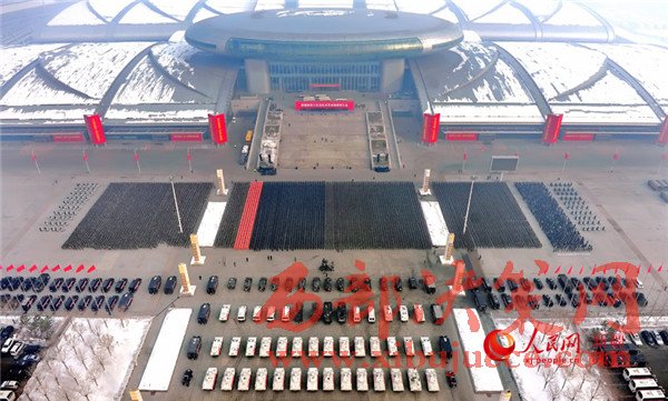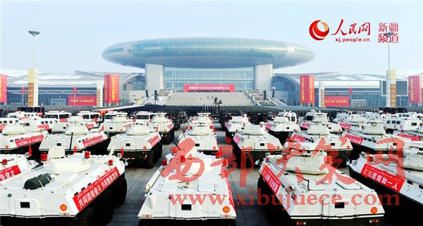 新疆國際會(huì)展中心廣場上,1萬余名武警官兵、公安民警、民兵預(yù)備役人員等各維穩(wěn)力量緊握鋼槍盾牌、整齊列隊(duì)挺立,直升機(jī)在空中盤旋,一輛輛軍車、裝甲車、摩托車列隊(duì)待發(fā)。