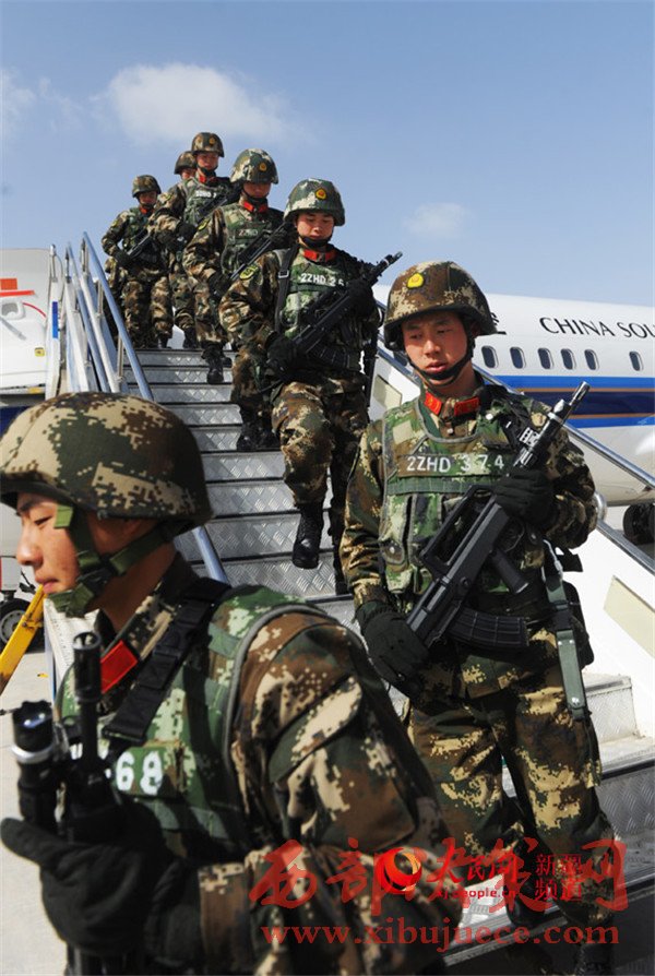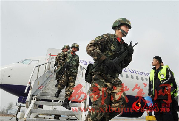 參加反恐維穩(wěn)誓師大會(huì)的武警官兵到達(dá)喀什機(jī)場,向任務(wù)區(qū)進(jìn)發(fā)。