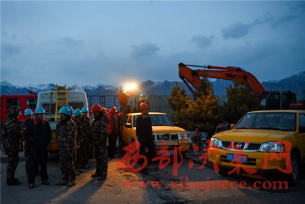3月25日晚,救援人員在包頭市北只圖村向陽小區(qū)爆炸事故現(xiàn)場附近待命
