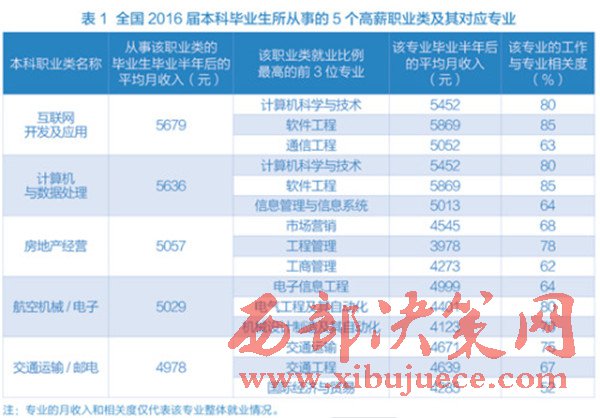 近日,麥可思研究院發(fā)布了一份有關(guān)中國大學畢業(yè)生收入情況的調(diào)查報告。數(shù)據(jù)顯示,在2016屆本科畢業(yè)生從事的職業(yè)類別中,“互聯(lián)網(wǎng)開發(fā)及應用”領(lǐng)跑職業(yè)高薪榜,畢業(yè)半年后平均月薪達5679元,此外,“房地產(chǎn)經(jīng)營”也在高薪榜前列。