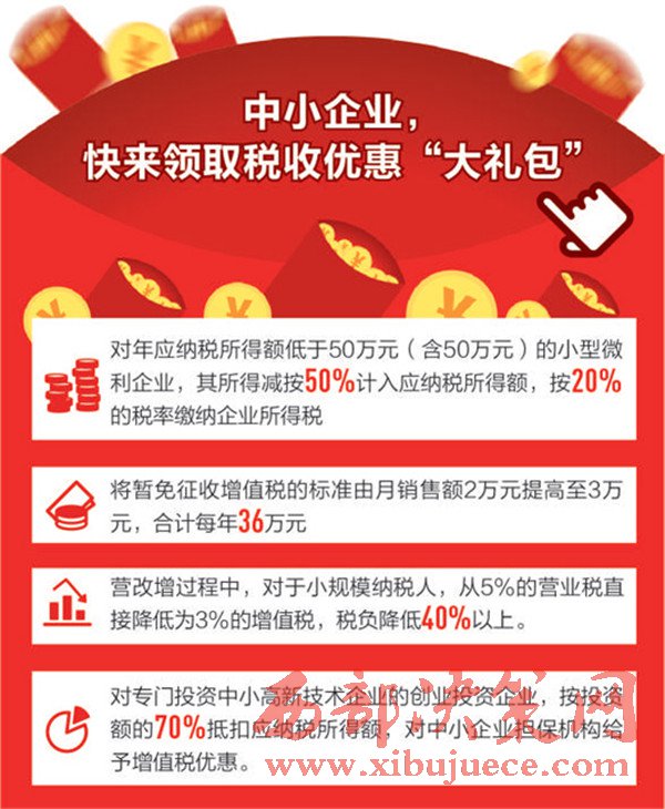 日前國務(wù)院常務(wù)會議決定,在今年已出臺4批政策減稅降費7180億元的基礎(chǔ)上,繼續(xù)出臺多項降費舉措,預(yù)計每年可再減輕企業(yè)負擔(dān)2830億元,合計全年為企業(yè)減負超過1萬億元。今年以來,國家持續(xù)推出減稅降費措施,讓企業(yè)輕裝上陣,成為推進供給側(cè)結(jié)構(gòu)性改革、培育我國競爭新優(yōu)勢的重要舉措。就在國務(wù)院出臺多項降費舉措的同時,財政部、國家稅務(wù)總局也發(fā)出通知,將享受所得稅優(yōu)惠政策的小型微利企業(yè)年應(yīng)納稅所得額上限由30萬元提高至50萬元,自2017年1月1日至2019年12月31日,對年應(yīng)納稅所得額低于50萬元(含50萬元)的小型微利企業(yè),其所得減按50%計入應(yīng)納稅所得額,按20%的稅率繳納企業(yè)所得稅。