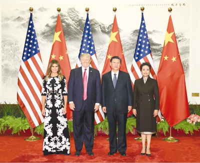 11月9日,國家主席習(xí)近平在北京人民大會(huì)堂東門外廣場舉行歡迎儀式,歡迎美利堅(jiān)合眾國總統(tǒng)唐納德·特朗普對(duì)中國進(jìn)行國事訪問。這是習(xí)近平和夫人彭麗媛在人民大會(huì)堂同特朗普夫婦合影。(記者 蘭紅光 攝)