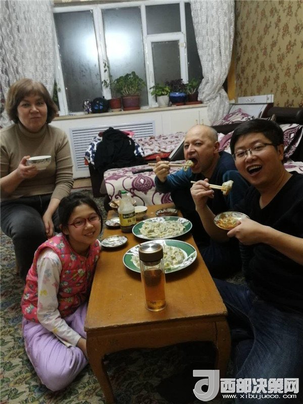 艾來提·賽買提的父親賽買提·阿合買提一面接過韓莉書記手里的米、面、清油和兩大兜食材,一面心疼地埋怨:“這么冷的天,你們又拿這么多東西,多辛苦,你上次送來的東西還沒有吃完呢。”韓莉和王艷萍笑而不語,心里默默地盤算著帶給親戚意外的驚喜。因為艾來提·賽買提和愛人長期兩地分居,聚少離多。今天正好是他們父母結(jié)婚三十周年紀念日,她們?nèi)嗽缇蜕塘亢靡欢ㄒH手做一頓飯,邀請這個民族團結(jié)大院里附近的同事和各自的親戚一起來給這個小家庭舉辦一場別開生面的大融合聚會,她們忙碌著,擇、洗、炒,撲鼻的香味彌漫在親戚的家中……
