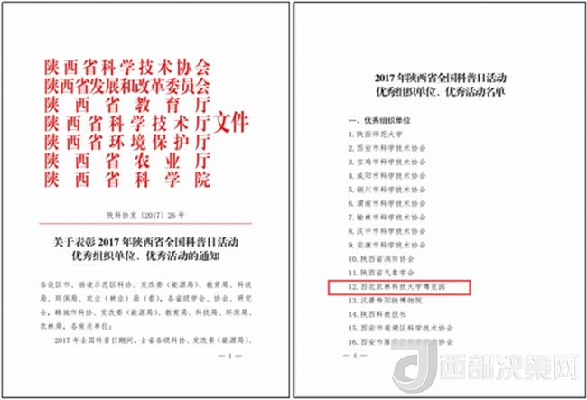 近日,陜西省科協(xié)、省發(fā)改委、省教育廳、省科技廳、省環(huán)保廳、省農(nóng)業(yè)廳和省科學院聯(lián)合發(fā)布了《關(guān)于表彰2017年陜西省全國科普日活動優(yōu)秀組織單位、優(yōu)秀活動的通知》,西北農(nóng)林科技大學博覽園獲評2017年全國科普日活動優(yōu)秀組織單位。