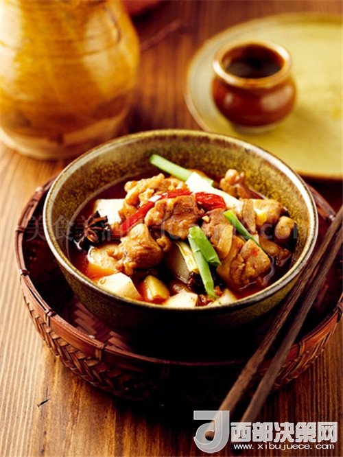3. 加熱1與湯池老醬,翻炒后,倒入純凈水。蓋上蓋以小火燜煮30分鐘,調(diào)味即可上盤(pán)。