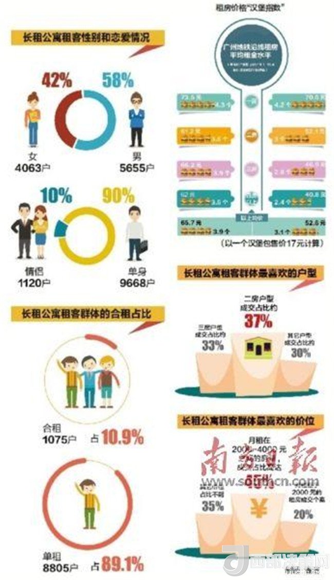 另有統(tǒng)計表明,廣州的人均租房支出在收入中所占的比例為38%,這意味著對大部分的租房族來說,房租已成為他們每月最主要的開支。在廣州,一個普通漢堡包大概賣17元,那么在地鐵沿線租房,每平方的月租金可以吃到幾個漢堡包呢?