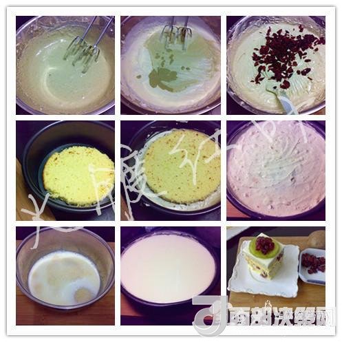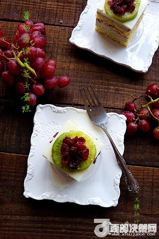 18蛋糕脫模切件,加放個人喜愛的水果片在蛋糕上,撒上用果汁泡軟的蔓越莓,即可食用