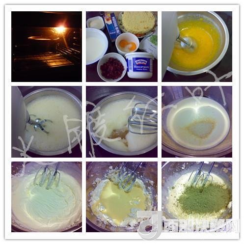 蔓越莓, 馬斯卡彭奶酪250克,蛋黃2個,檸檬汁5克,糖60克,牛奶100克,綠茶粉20