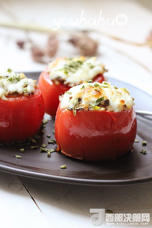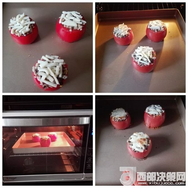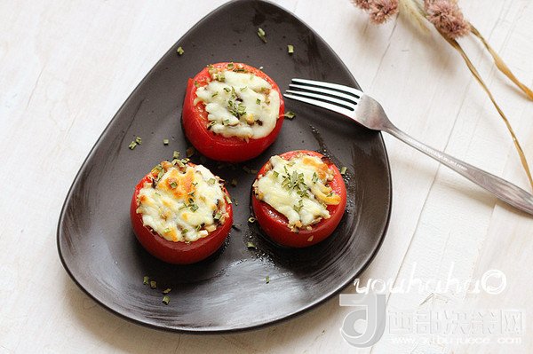 7、到時(shí)取出烤盤(pán),西紅柿裝盤(pán),撒少許的干蔥即可。