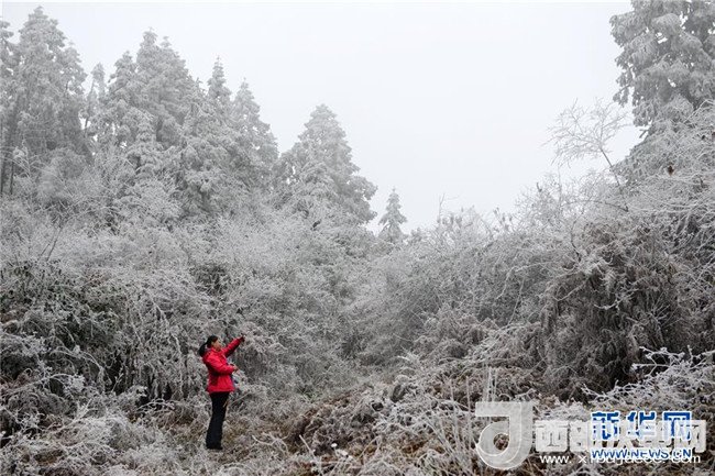 1月7日,一名游客在貴州省黔東南苗嶺國家地質(zhì)公園拍攝霧凇景觀。寒冬時(shí)節(jié),位于貴州省黔東南州的苗嶺國家地質(zhì)公園出現(xiàn)云海霧凇景觀,原始森林和草場在云海中若隱若現(xiàn),美若畫卷。(楊文斌攝)