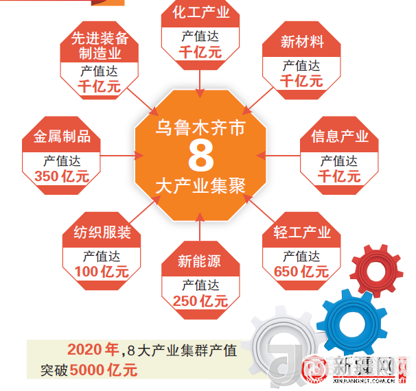 根據(jù)《關(guān)于加快烏魯木齊市工業(yè)重點(diǎn)產(chǎn)業(yè)集群發(fā)展的意見》,烏市將加快發(fā)展化工、先進(jìn)裝備、新材料、新能源、信息、輕工業(yè)、金屬制品、紡織服裝八大產(chǎn)業(yè)集群及產(chǎn)業(yè)集聚區(qū)。到2020年,八大產(chǎn)業(yè)集群產(chǎn)值突破5000億元。其中,化工產(chǎn)業(yè)產(chǎn)值達(dá)到“千億”規(guī)模、先進(jìn)裝備制造產(chǎn)業(yè)產(chǎn)值達(dá)到“千億”規(guī)模、硅鋁基電子新材料和高分子膜材料產(chǎn)業(yè)產(chǎn)值達(dá)到“千億”規(guī)模、新能源產(chǎn)業(yè)達(dá)到250億元規(guī)模、信息產(chǎn)業(yè)產(chǎn)值達(dá)到“千億”規(guī)模、輕工產(chǎn)業(yè)達(dá)到650億元規(guī)模、金屬制品達(dá)到350億元規(guī)模、紡織服裝產(chǎn)業(yè)達(dá)到100億元規(guī)模。