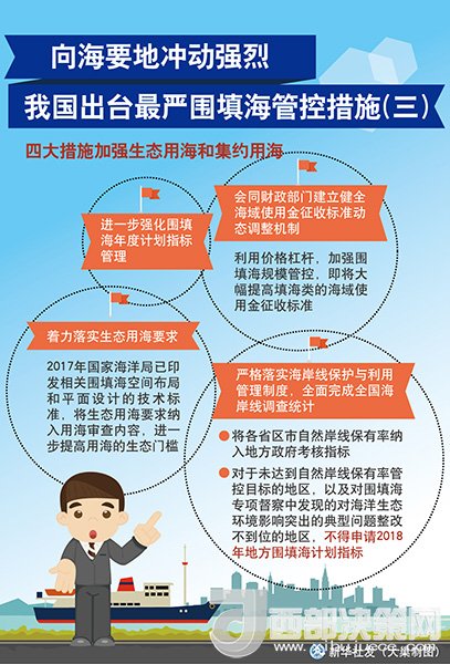 17日,國家海洋局舉行圍填海情況新聞發(fā)布會,國家海洋局副局長林山青宣布,結(jié)合圍填海督察整改工作,國家海洋局將采取“史上最嚴(yán)圍填海管控措施”,以期保護(hù)優(yōu)先、集約利用的用海理念牢固確立,使海域開發(fā)利用得到可持續(xù)發(fā)展。