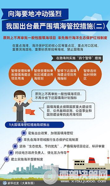 在渤海則實施“四個暫停”措施--暫停受理和審批圍填海建設(shè)項目用海,暫停受理和審批區(qū)域建設(shè)用海規(guī)劃,暫停下達(dá)圍填海建設(shè)項目用海指標(biāo),暫停選劃臨時傾倒區(qū)。