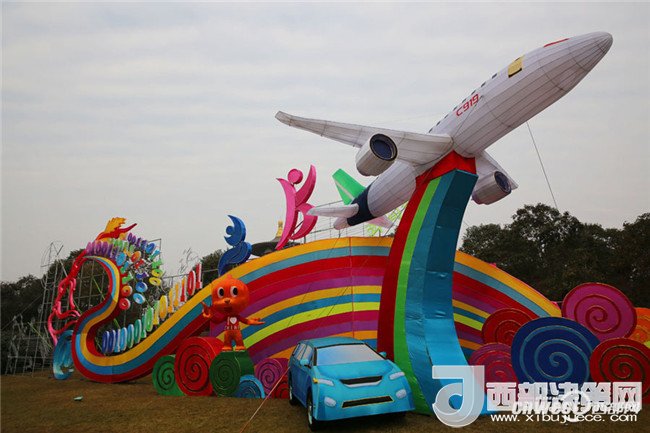 中國自主設(shè)計研制的C919國產(chǎn)大型客機也做成了彩燈,展示國家高精尖科技實力。