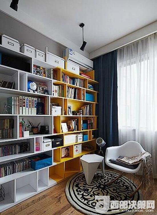 兩種不同顏色的書架拼接在一起,錯落的收納格讓小小書房顯得活潑而有層次感。一把單人椅,讓人能夠享受安靜閱讀時光。