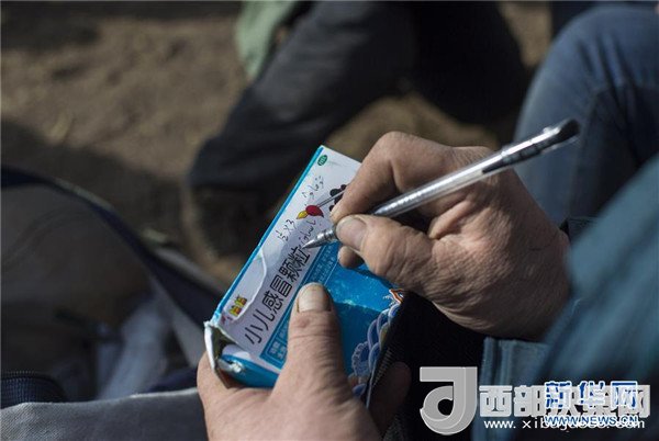 巡診隊醫(yī)生賽山在藥品上仔細(xì)用哈薩克語注明使用方法(2017年12月18日攝)。