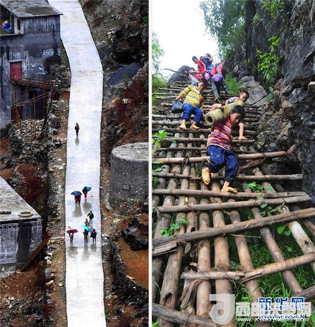 2012年9月3日,廣西大化瑤族自治縣板升鄉(xiāng)弄勇村弄頂屯的孩子們扛著生活用具去學(xué)校(右圖);2017年1月11日,水泥公路已經(jīng)從學(xué)校修通到家門(mén)口(左圖)。隨著脫貧攻堅(jiān)工作不斷推進(jìn),原本“千重山,萬(wàn)層嶺,不通水,不通電”的廣西大石山區(qū)發(fā)生了翻天覆地的變化。記者黃孝邦攝
