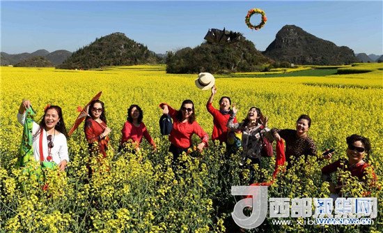 游客們在云南省羅平縣的油菜花田里合影(2月28日攝)。新華社記者 藺以光 攝