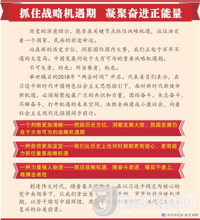 舉世矚目的2018年“兩會時間”開啟。代表委員們表示,在習(xí)近平新時代中國特色社會主義思想指引下,面對新時代新使命新機(jī)遇,必須凝聚起最廣泛的共識和力量,團(tuán)結(jié)奮斗、矢志奮斗、不懈奮斗,打開機(jī)遇的未來空間,決勝全面建成小康社會,向著社會主義現(xiàn)代化強(qiáng)國闊步前行。