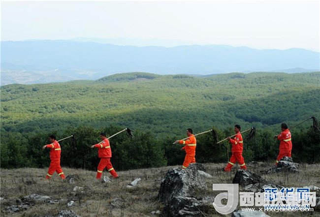 沙子坡林場(chǎng)的護(hù)林員在夕陽下巡山歸來(2013年7月7日攝)。