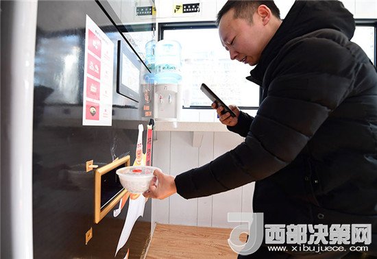 在位于西安曲江創(chuàng)客大街邊的一家無(wú)人面館內(nèi),市民用手機(jī)拍攝機(jī)器剛做好的面食(1月10日攝)。新華社記者 邵瑞 攝