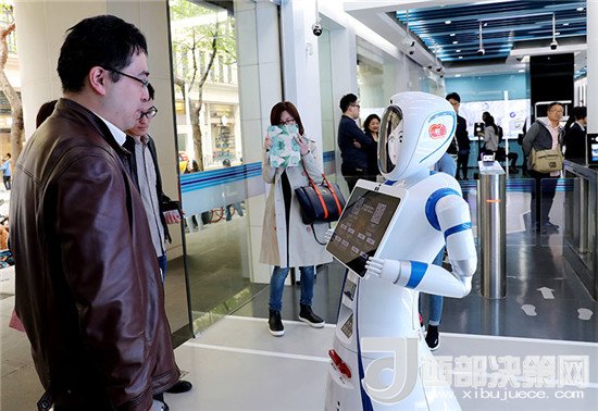 一位市民在位于上海九江路的無(wú)人銀行入口處向迎賓機(jī)器人說(shuō)明需要辦理的業(yè)務(wù)種類(lèi)(4月12日攝)。近日,中國(guó)建設(shè)銀行在上海九江路開(kāi)出國(guó)內(nèi)首家無(wú)人銀行。新華社記者 方喆 攝