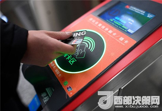 乘客在杭州地鐵豐潭路站體驗(yàn)使用帶有閃付功能的銀聯(lián)IC卡過(guò)閘乘車(chē)(2017年12月27日攝)。新華社記者 黃宗治 攝